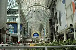 A shopping mall is a type of shopping center, a North American term originally meaning a pedestrian promenade with shops along it, but in the late 1960s began to be used as a generic term for large shopping centers anchored by department stores, especially enclosed centers.[4][5] Many malls in the United States are currently in severe decline ("dead malls") or have closed. Successful exceptions have added entertainment and experiential features,[6] added big-box stores as anchor tenants, or are specialized formats: power centers, lifestyle centers, factory outlet centers, and festival marketplaces.[7] Smaller types of shopping centers in North America include neighborhood shopping centers, and even smaller, strip malls. Pedestrian malls (shopping streets) in the United States have been less common and less successful than in Europe.[4][5] In Canada, underground passages in Montreal and Toronto link large adjacent downtown retail spaces.