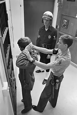 Shore patrol (SP) are service members who are provided to aid in security for the United States Navy, United States Coast Guard, United States Marine Corps, and the British Royal Navy while on shore.[1] They are often temporarily assigned personnel who receive limited training in law enforcement and are commonly armed with a baton.[2] Their primary function is to make certain that sailors, marines, and coast guardsmen on liberty do not become too rowdy. They will also provide assistance for Department of the Navy and U.S. Coast Guard uniformed personnel in relations with the civilian courts and police.[3]