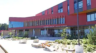 The high school's 42-acre (17 ha) campus was originally on land leased from the Washington State Department of Natural Resources until the Shoreline School District bought it outright in 1985.[3] Shorecrest moved to a new building on the campus over two phases in 2012 and 2014 that cost $94 million to construct. The new buildings include a three-story academic building with a commons area and library, a separate gymnasium and athletic complex, and a performing arts center with a 450-seat theater.[4]