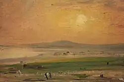 Converted railway carriages became summer homes around the start of the 20th century, and 'Bungalow Town', as it was then known, became home to the early British film industry.[9] Francis L. Lyndhurst founded the Sunny South Film Company, which made its first commercial movie on Shoreham Beach in 1912 and built a film studio there.[10][11] Shoreham Beach officially became part of Shoreham-by-Sea in 1910. Much of the housing in the area was cleared for defence reasons during the Second World War and most of what remained after the war is now long gone, having been replaced by modern houses.[12] The Church of the Good Shepherd, built in 1913, still stands. Along the Adur mud flats adjacent to Shoreham Beach sits (and at high tides floats) a large collection of houseboats made from converted barges, tugs, mine sweepers,[13] and motor torpedo boats. The seaside shingle bank of Shoreham beach extends further east past the harbour mouth, forming the southern boundary of the commercial harbour in Southwick, Portslade, and Hove. The Monarch's Way long-distance footpath, commemorating the escape route of Charles II to France after the Battle of Worcester, follows the beach westwards from Hove past Portslade and Southwick, ending by the harbour mouth's east breakwater.