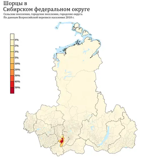 Resettlement of the Shors in the Siberian Federal District by urban and rural settlements in %, 2010 census