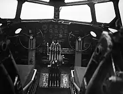 The cockpit containing the flying officers was provided with numerous controls and features; to the left of the first pilot were the controls for the auto-pilot and a P.4 compass; the pilot was also provided with a beam approach indicator (to aid nighttime landings) and DF visual loop indicator in addition to the standard flight controls.[31] Switches for the flaps and position indicators were located on a central panel set between the two pilots, while the master fuel cocks were set above these on the roof; throttle and mixture controls were also normally positioned between the pilots. Only limited engine instrumentation was provisioned for, such as engine speed indicators and boost gauges.[31]
