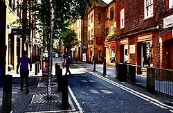 The western stretch, one of the prongs that runs off Seven Dials, was known as Queen Street until 1903.[1] The eastern stretch was named Shorts Gardens after William Short, the gardener of Gray's Inn who purchased the land in 1590 when it was still open countryside outside London and was owned by his descendants until 1690 when it was sold off for development.[2][3] The western end featured houses built in the late 17th century and intended for the rich, but during the following century this became a slum as part of the rookery of St Giles. The eastern stretch had poorer inhabitants from the beginning and at one point became a centre for Italian organ grinders. This gave way over time to warehouses servicing the fruit trade in nearby Covent Garden market.[2] When built, it was residential; it is now largely commercial. Neal's Yard runs off the street as does Nottingham Court. At Seven Dials on the corner between Shorts Gardens and Monmouth Street is The Crown pub, dating back as tavern to at least 1700.[4]