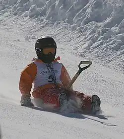 Competitive shovel racing has its roots in New Mexico's ski resorts in the 1970s. Creator Damien Deleon has been unofficially credited as the "king of shovel racing." [1] It began after ski resort workers used shovels as sleds to quickly move from one location to another.[2] The sport reached the zenith of its popularity in 1997 when it was featured in the Winter X Games, although the games organizers later removed the sport in future X Games after athlete Justin Williams died during the games.[3] The most prominent competition is held at the Angel Fire Resort in Angel Fire, New Mexico. In 2005, the resort that hosted the largest annual competition dropped the event due to liability concerns, but it resumed in 2010 after modified sleds were banned from competition. Riders often decorate their sleds with custom paint jobs. There is a wide age range in competitors, including students and retirees.[4]