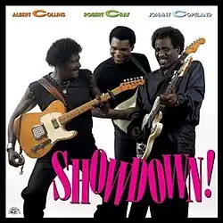 Showdown! is a collaborative blues album by guitarists Albert Collins, Robert Cray and Johnny Copeland,[1] released in 1985 through Alligator Records.[4] The album is mostly original material, with cover versions of songs like T-Bone Walker's "T-Bone Shuffle", Muddy Waters' "She's into Something" and Ray Charles' "Blackjack". Collins, Cray and Copeland were supported by Johnny B. Gayden and Allen Batts, who at the time were members of Collins' Icebreakers, and Alligator's household artist Casey Jones. In the album's sleeve notes, producers Bruce Iglauer and Dick Shurman wrote that Copeland and Cray were both supported by Collins early in their careers, and how the three musicians often crossed paths since, making this collaborative effort a "thirty years in the making" project. Showdown! was one of Alligator's most successful albums, peaking at #124 on the US charts and selling over 175,000 units worldwide.[5] The album won a Grammy Award for Best Traditional Blues Recording in 1986.[6] It was re-released on CD by Alligator in 2011.[4]