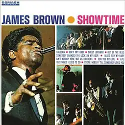 Showtime is the seventh studio album by American musician James Brown. The album was released in April 1964, by Smash Records.[3] It was the transition album from King Records to Smash Records, however, limited by contractual obligations with King Records, Brown released an album of remakes overdubbed with canned applause.[1] Brown's vocal group, The Famous Flames are included in the album's introduction, are featured on the album's cover, and are featured on several of the album's tracks including "Don't Cry Baby", "Out of the Blue" and "Caldonia". The album was arranged by Sammy Lowe.