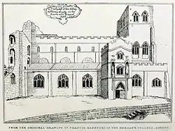 On 25 February 1083 Earl Roger summoned his senior officials, including Warin, the Sheriff of Shropshire and Picot de Say, and publicly pledged himself to found a new Abbey, laying his gloves on the altar of St. Peter and granting the whole suburb outside the east gate for the construction.[14] Reginald and Frodo, two monks from the great Benedictine Abbey of Saint-Martin-de-Séez in Southern Normandy, formed the nucleus of the new community, and began to plan and build the monks' lodging, working with Ordelerius and Warin.[15][16] The Domesday Book found the abbey under construction: "In the City of SHREWSBURY Earl Roger is building an Abbey and has given to it the monastery of St Peter where the parish (church?) of the City was."[17][18] This suggests that Siward's foundation was already a monastery before Earl Roger began building but it is fairly certain there was no more than a wooden parish church.[4]