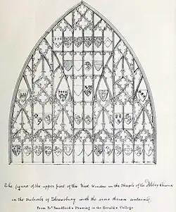 The abbots became increasingly important political figures.[72] Since the confiscation of Earl Robert's lands by the Crown, each Abbot of Shrewsbury was a tenant-in-chief, and with the summoning of Parliament in the reign of Henry III, compelled to attend.[73] Abbot Luke bought a house in London to make it easier for himself and his successors to attend Parliament and perform other important political business.[74] This was a good buy, as when the number of abbots summoned to parliament was fixed at 28 during the reign of Edward III, the Abbot of Shrewsbury was one of them.[73] The Victoria County History asserts that the abbots were permitted by the Pope to wear the mitre from 1397.[75] Abbot Richard Lye actually died in London while on parliamentary business in 1512 and was buried at St Bartholomew-the-Less in Smithfield.[76]