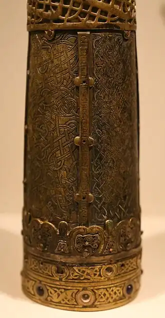 An inscription on one of the binding strips translates as "A prayer for Maolseachnail O Callaghan, Ard Ri of the Ua Ealach Mumhain who made this shrine".[19][20] Other inscriptions, also on the strips, mention Tadhg Mac Carthaigh, a King of Desmond (which covered roughly today's County Cork and most of County Kerry) from 1118, and who was probably its commissioner, Diarmuid son of Mac Denisc, and Máel Sechnaill Ua Cellachain (d. 1121) and others[3] whoes names place its origin in Cork.[3][4] The identification of Tadhg Mac Carthaigh as commissioner is based on the shrine's similarity to other known works whose creation his family oversaw, including the sarcophagus, high cross and Cormac's Chapel at the Rock of Cashel, County Tipperary.[21] Unlike other surviving or documented arm-shaped reliquaries not built to hold primary corporeal remains and instead used for ceremonial or symbolic purposes, Saint Lachtin's Arm is known to have once held Lachtin's bones, which would have been enshrined following a disheartenment.[22]