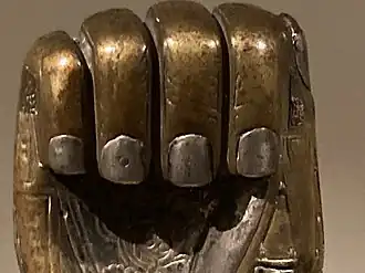 The hand and fingers are made from a variety of shaped plates and have cast-interlace and silver filigree.[1] The inlay around the fingernails employs silver ribbons framed with niello (a black mixture for inlay), a technique described by Roger Stalley as creating an "attractive black and silver pattern set against a gilded bronze base...[that is]...exploited in an ambitious fashion on the shrine of Saint Lachtin's Arm".[15] The plate below the fingers contains acanthus foliage.[1]