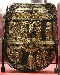 Crucifixion and central rock crystal boss. John the Baptist is to the left, Mary to the right -
