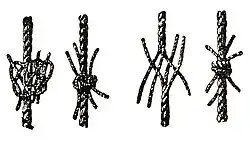 Shroud knots, in general, are a class of knots in which the individual strands of laid rope are knotted, but not woven, to the individual strands of another laid rope. This makes them more secure than a simple bend but less secure than a full splice; however, they use less rope than a full splice would. The most common form of shroud knot involves two interlocking wall knots.[1]