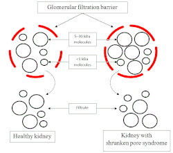 It has been speculated that SPS is both caused by, and exacerbates, cardiovascular disease.[1][3] It was stated in 2014 that the kidneys have a role in maintaining the equilibrium between production and catabolism of most proteins between about 5 and 30 kDa in molecular mass and that failure to do so results in serious disease and strongly increased mortality, when the kidney disorder shrunken pore syndrome was identified.[1][2][3] Proteins less than 30 kDa comprise about 36% of the total human proteome.[1] A hypothesis concerning the pathophysiology of SPS is that several 5–30 kDa proteins with signalling functions, for example cytokines, are increased in concentration and promote development of serious disorders like cancer and cardiovascular disorders.[1][3]