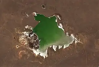 Steppe vegetation grows in the area surrounding the lake, made up of mainly wormwood, Kochia and, more rarely, Achnatherum. There are no reeds along the shoreline and no aquatic plants in the water.[3]