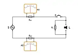 However, the series resistors RM1 and RM2 are low Ohmic resistors (like in the photo) meant to pass current around the instruments M1 and M2, and function as shunt resistors to those instruments. RM1 and RM2 are connected in parallel with M1 and M2. If seen without the instruments these two resistors would be considered series resistors in this circuit.