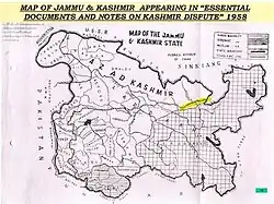 Map of the State of Jammu and Kashmir showing the Cease Fire Line as Agreed Upon in the Karachi Agreement, Ratified by the Governments of India and Pakistan on 29 and 30 July Respectively. (See Annex 26 to the third Interim Report of the United Nation Commission for India and Pakistan)[23][24]