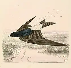 The Siberian house martin was formally described in 1811 by the German naturalist Peter Simon Pallas under the binomial name Hirundo lagopoda. He specified the locality as Dauria, a mountainous region to the east of Lake Baikal in Russia.[2][3] The specific epithet combines the Ancient Greek lagōs meaning "hare" with pous, podos meaning foot, a reference to the Siberian martin's fully-feathered feet.[4] The Siberian house martin is now placed in the genus Delichon.[5] This martin was formerly considered to be a subspecies of the common house martin but was promoted to species status based on morphological and vocal differences.[5][6] The species is monotypic: no subspecies are recognised.[5]