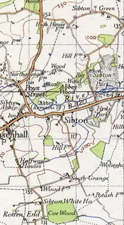 Sibton is a village and civil parish on the A1120 road, in the East Suffolk district, in the English county of Suffolk. It is near the towns of Saxmundham and Halesworth, the village of Peasenhall and the hamlet of Sibton Green. The church is dedicated to St Peter; there is also the remains of a medieval abbey, Sibton Abbey. There is a large stately house set in the grounds of Sibton Park which dates back 1827 in the Georgian period,[1] which is now used as a hotel. The estate consists of 4500 acres,[2] being part of the Wilderness Reserve where there are holiday cottages and a lake. The Parish is also in close proximity to the River Yox which runs past the White Horse Inn and down through Pouy Street, it then goes on past both the A1120 road and a small, wooded area called Abbey Woods to pass through the grounds of Sibton Park and then on to Yoxford.