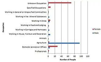 The graph shows the occupations of the citizens of Sibton in 1881 and the main occupation was in agricultural work, with 96 men and three women working in this sector. The second highest sector was in domestic service or offices. Census information from 1831 states that nearly three quarters (91 people) of Sibton's population was a labourer or a servant and 21 people were employers or professionals.[7] This is similar to the 1881 occupation statistics which showed that 99 people worked in agriculture, which is a similar figure for how many labourers there were in 1831 suggesting there was little change in these years. However, in 2011 the occupation statistics of the parish were very different, with just seven people working in agriculture. The highest sector of employment for Sibton in 2011 was people working in accommodation or food industry, with fifteen people working in this industry.[8]