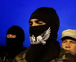 The Sich Battalion was formed by the far-right Svoboda party in June 2014.[2] The unit is one of several Ukrainian paramilitary volunteer battalions formed at the start of the war in Donbas in 2014, along with the Svyatyi Mykolai Battalion and the Donbas Battalion, to fight against pro-Russian separatists in the Donbas region of Ukraine. The Sich Battalion officially became an active unit of Ukraine's Ministry of Internal Affairs following its oath taking ceremony on 26 August 2014, and is composed of around 50 volunteers, some of whom have prior military service.[3] Like other volunteer units, Sich Battalion members underwent two months of basic training before activation. They began engaging separatist forces with minimal training or equipment. While the Sich Battalion was much smaller than other volunteer units, it was designed for the specific purpose of combating insurgents in the 2014 pro-Russian unrest in Ukraine.[4]