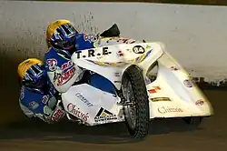 Racing sidecars on speedway involves a rider and a passenger mounted on a 1000cc purpose built, three-wheeled sidecar outfit. The passenger of the machine is as much involved in the race performance as the rider. The two members of the sidecar crew work in unison to ride the outfit as best they can. Speedway circuits are a loose shale surface and therefore traction is all important. The passenger plays a major part in controlling the amount of traction being created on the rear wheel. He does so by moving his weight forwards, backwards and sideways (either into or out of the machine). The outfit only ever turns right so the passenger only finds himself on the right hand side of the outfit.