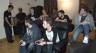 The Sidemen (background) and friends playing FIFA at the first "Sidemen House".