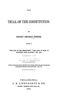 Fisher's most influential and profound achievement was his book The Trial of the Constitution published in 1862.[1] According to the political scientist William H. Riker, that book was the first to interpret the U.S. Constitution "in light of the prevailing European tradition of centralized, responsible government", and it "deserves a permanent place among commentaries on American government...."[2] The historian and political scientist Clinton Rossiter has written of Fisher's book that, "This great book is an eloquent statement of the powers of emergency and self-preservation inherent in the Constitution and government."[5]