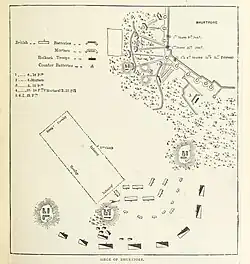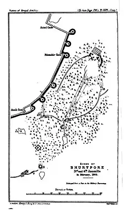 The siege of Bharatpur took place between 2 January and 22 February 1805 in the Indian Princely state of Bharatpur (now part of Rajasthan), during the Second Anglo-Maratha War. Forces of the British East India Company, led by General Gerard Lake, were repulsed four times in their attempts to storm the fortress.[2]