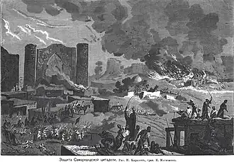 The siege of Samarkand, or siege of the Samarkand Citadel, was a military engagement fought in the city of Samarkand (in modern-day Uzbekistan) in June 1868. In the engagement, a small garrison of Russian Imperial soldiers was besieged by a combined army of Bukhara soldiers and its allies - including the Kokand Khanate and tributary Turkmen-Uzbek tribes.[2] The siege played an important role in the 1868 campaign of Russian conquest of Bukhara.