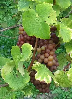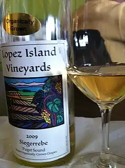 Siegerrebe (German pronunciation: [ˈziːɡɐˌʁeːbə] ⓘ, lit. 'Victory vine') is a white wine grape that is grown primarily in Germany with some plantings in England, Vancouver Island,[1] Washington state,[2] British Columbia's North Okanagan and Fraser Valley[3] and Nova Scotia's Annapolis Valley along with a small planting in Tasmania, Australia at Every Man and His Dog Vineyard,[4] and another in the Finger Lakes AVA in New York State.[5] Siegerrebe was created by German viticulturalist Dr. Georg Scheu (1879–1949) in 1929 at a grape-breeding institute in Alzey in Rheinhessen, by crossing Madeleine Angevine and Gewürztraminer.[6][7] However, Georg Scheu's son Heinz Scheu has claimed in a book that Siegerrebe was the result of self-pollination of Madeleine Angevine.[7] Siegerrebe received varietal protection and was released for general cultivation in Germany in 1958.[7]