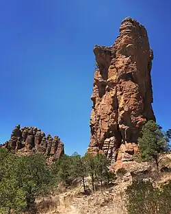 Sierra de Órganos is nestled within the Sierra Madre Occidental mountain range, in an area that corresponds to the physiographic province of the Mexican Plateau. The topography is uneven, with elevations ranging from 2,120 to 2,560 metres (6,960 to 8,400 ft) above sea level.[1] This gives rise to dramatic ridges and steep peaks that form small plateaus, often with very prominent, nearly vertical cliff faces. Small valleys surrounding the peaks afford scenic views of the rock formations from below.[5]
