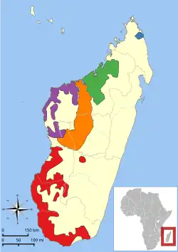 Predators of the sifaka include the fossa, a puma-like mammal native to Madagascar, and aerial hunters such as hawks.[9] The sifaka usually avoids these attacks with its agile acrobatics through the trees high above the ground. However, they have been known to attack by biting and scratching and have even been witnessed fighting off a Madagascar ground boa.[10]