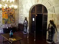 With foundations dating back to the 5th century, Sigüenza Castle was extended by the Moors in the 8th century and retaken by the Christians under Bernard of Agen in 1123.[3] In the late 18th century, Bishop Juan Díaz de la Guerra changed the appearance of the castle from a fortress into an episcopal palace with additional windows, balconies and stables. However, in 1808 during the War of Spanish Independence the castle was taken by the French who seriously damaged it and looted all its riches before it was recaptured by El Empecinado. The episcopal palace was further devastated by fire in the 1830s and had to be abandoned.[4] In 1976, after comprehensive restoration, the castle was opened as a Parador luxury hotel. The official inauguration took place in 1978 with the visit of King King Juan Carlos and Queen Sofía.[4] Decorated with banners and suits of armour, the huge lounge was originally the castle's dining room.[5]