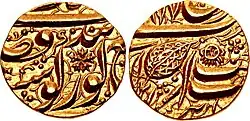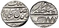 Ala Singh had been recognized by Ahmad Shah Abdali as a ruler in 1761, with Abdali bestowing him with the raja title in 1765.[1] The first coin issued by Ala Singh bears the date A.H. 1178 / R.Y. 19 (c. 1764–1765).[10] As Ala Singh was the governor of Sirhind, the coins bear the name of Sirhind, although they were actually minted at Patiala.[10] Ala Singh's successor, Amar Singh, received the Rajah-i-Rajgan title and permission to issue coinage from Abdali in March 1767 onwards.[1] These coins, called Rajeshahis, were gold mohurs and silver rupees (approx. 10 grams or 11-1/4 mashas) that bore Persian inscriptions bearing the name of Ahmad Shah Abdali.[1]