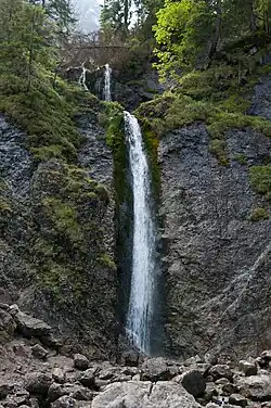 Siklawica Falls is located at 1,100 metres (3,600 ft) above sea level on the Strążyski Potok brook in the Strążyski Valley of the Western Tatras.[1] The 24-meter high waterfall lies within the Tatra National Park.[2] It descends from two nearly vertically inclined walls (at an angle of 80°) and consists of two main cascades. The height of both the lower and upper cascade is 12 m.[3]