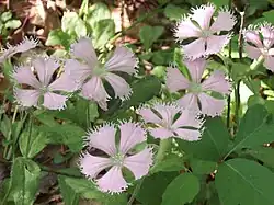 This plant is a rhizomatous perennial herb growing from a thick taproot topped with a woody, branching caudex. There are several stems and shoots measuring up to 40 centimeters in length. The lance-shaped leaves are each up to 9 centimeters long by 25 wide and grow in pairs along the stem. The inflorescence usually has three flowers. Each flower has five pink or white fan-shaped petals with fringed tips, each measuring 1.5 to 2.5 centimeters long. The base of the flower is encased in a papery 10-veined calyx of sepals.[6] The plant can reproduce vegetatively by resprouting from its rhizome, so what appears to be several plants may be one plant with genetically identical clones.[1]