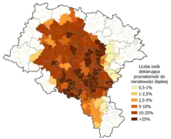 About 209,000 of the Upper Silesian population declared themselves as pure Silesians, 376,000 people declared themselves as having a joint Silesian and Polish nationality while only 471,000 people declared themselves to be of only Polish nationality from Silesia in the 2011 Polish national census making them the largest minority group in Poland. About 126,000 people declared themselves as members of the German minority (58,000 declared it jointly with Polish nationality), making it the third largest minority group in the country (93% of Germans living in Poland are in the Polish parts of Silesia). 31,301 people declared Silesian nationality in the 2021 Czech census, including 18,850 of those who declared two nationalities[3] (44,446 in Czechoslovakia in 1991),[10] and 6,361 people declared joint Silesian and Moravian nationality in the 1991 Slovak national census.[11] Over 85% of the population in the Polish part of Upper Silesia declare themselves as Poles, and in the Czech part as Czechs.