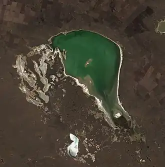 The lake basin covers 777 square kilometres (300 sq mi) but the actual area covered by water varies according to the seasons. The lake reaches a maximum depth of 3.2 metres (10 ft)[1] and has a volume of about 1.5 cubic kilometres (0.36 cu mi).[2] The northern and eastern shores are high and straight while the western shore is low-lying and indented, gradually giving way to salt marshes. Hydrogen sulfide is emitted from deposits at the bottom of the lake.[1] Smaller lake Zhamantuz lies close to the southwestern tip, and lake Zhaksytuz 34 kilometers (21 mi) to the south. Other lakes in the vicinity are Kyzylkak 14 km (8.7 mi) to the east of its northern end, Teke 36 kilometers (22 mi) to the north, and Ulken-Karoy 60 km (37 mi) to the northwest.[3][5]