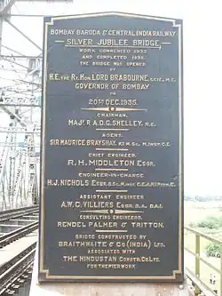 The bridge was constructed for the Bombay, Baroda and Central India Railway. It was built by Braithwaite & Co. in association with the Hindustan Construction Company, who built the piers. The bridge was named in honour of the fat, silver jubilee of King-Emperor George V.