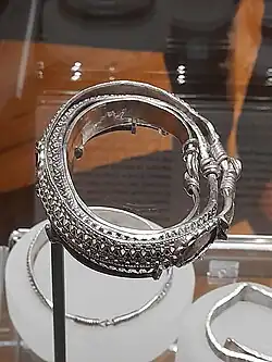 In October 2013, it was announced that the hoard had been purchased by Lancashire County Museum Service with the assistance of grants of £45,000 from the National Heritage Memorial Fund and £33,000 from the National Art Fund. It formed the basis of a display "The Silverdale Hoard: the Story So Far" in Lancaster City Museum from 25 October to 21 December 2013, which attracted record visitor numbers to the museum.[12] It was subsequently moved to the Museum of Lancashire, Preston, being displayed from 15 February to 7 December 2014. It was then to be the subject of further research and conservation work.[13][14][15] The Museum of Lancashire closed on 30 September 2016, although remaining open for pre-booked school groups.[16]