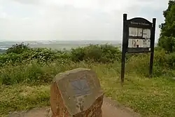 The high point allows for panoramic views over five counties; landmarks such as Lincoln Cathedral and Bolsover Castle can be seen from the summit.[4][3] The site also overlooks the Elizabethan Hardwick Hall, as well as the more modern M1 motorway.[2] The flat area of the viewpoint was originally laid out with stone blocks, at the ordinal points of the compass. A bronze statue of a kneeling coal miner with a Davy lamp was a later addition, located on a rock plinth in the centre of the viewpoint. The sculpture, called Testing for Gas, was created by artist Antony Dufort as "A tribute to the Miners of the Nottinghamshire coalfields", commemorating coal mining at the 85 Nottinghamshire collieries. Listed on the base are the names of the principal collieries in the county 1819–2005.[5][6]