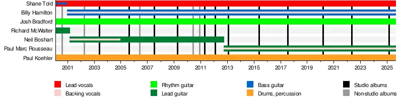 Silverstein's lineup remained unchanged from May 2001 to July 2012, then consisting of lead vocalist Shane Told, lead guitarist Neil Boshart, rhythm guitarist Josh Bradford, bassist Billy Hamilton, and drummer Paul Koehler. In September 2012, the band had announced that Neil Boshart had been fired and replaced by Paul Marc Rousseau, who also joined Billy Hamilton on backing vocals.
