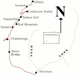 The Silverton Railroad was the first of several railroad projects by Otto Mears, the famed "Pathfinder of the San Juans". Construction of the line began in 1887 and reached Burro Bridge by early November, when work was halted for the winter. The route followed a survey made by the Denver & Rio Grande up Mineral Creek to climb Red Mountain Pass to reach the incredibly rich mining district around Red Mountain Town. Construction resumed and service began the following year, and the line reached Ironton in November.[3] The line reached its greatest extent in September 1889 with the completion from Ironton of a spur to a mill at Albany.[1]