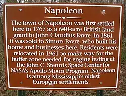 One of Favre's properties on the Pearl River was originally settled by his father in 1767, and was inherited by Favre upon his father's death in 1782. This plantation later became known as the town of Napoleon, and Favre kept a store there that later became a part of the community's church.[5] In 1961 all the residents of the town were moved when the property was declared within the buffer zone of the John C. Stennis Space Center. Another one of his Pearl River properties became the town of Pearlington, Mississippi, where many of his children, including those of his Choctaw mistress, lived.[5]