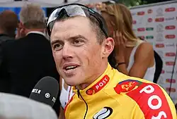 Simon Gerrans (born 16 May 1980) is an Australian former professional road bicycle racer, who rode professionally between 2005 and 2018, for the AG2R Prévoyance, Crédit Agricole, Cervélo TestTeam, Team Sky, Orica–Scott[2] and BMC Racing Team squads.[3] Post-retirement he initially worked as an athlete intern at Goldman Sachs in London,[4] then joined The Service Course, in which he is an investor, as COO and now CEO, in early 2020.[5][6][7] He can also be heard commentating road cycling for ASO and SBS.