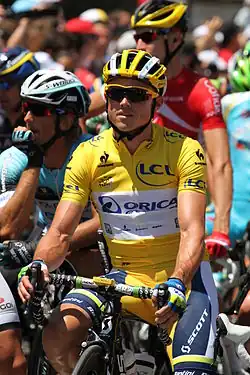 Gerrans was a two-time winner of the Australian National Road Race Championships, having won the title in 2012,[8] and 2014. Aside from his National Championship successes, his biggest triumphs were winning the Tour Down Under a record four times,[9] and getting the better of one-day races such as the 2009 GP Ouest-France, the 2012 Milan–San Remo, the 2012 and 2014 Grand Prix Cycliste de Québec,[10] the 2014 Liège–Bastogne–Liège, and stage wins in all three Grand Tours. In the 2013 Tour de France, Gerrans claimed the yellow jersey on Stage 4 after being part of the winning team in the Stage 4 team time trial in Nice.