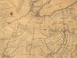 Later that year, St. Clair assembled a large force of regulars, six-month levies, and Kentucky militia at Fort Washington (now Cinncinati) on the Ohio River. Accompanied by a long baggage train, eight artillery pieces, teamsters, packhorse drivers, and some women and children, St. Clair's army proceeded slowly northwards towards the large Miami settlement of Kekionga. On 3 November, they encamped deep in Indigenous controlled territory alongside the Wabash River. No field fortifications were constructed and the river separated the militia from the regulars and levies.[66] Indigenous scouts tracked the movement of St. Clair's army, and more than a thousand Shawnee, Miami, Lenape, Wyandot, Odawa, Potawatomis, and Ojibwe warriors gathered to meet them. The warriors were led by Blue Jacket of the Shawnee and Little Turtle and the Miami. The Wyandot chose Girty to lead their contingent.[67]