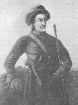 Girty's name has often been "synonymous with savagery and monstrosity."[41] Throughout the nineteenth century and into the twentieth, numerous authors portrayed Girty as a "monster" whose hands were "stained with the innocent blood of women and children."[47] For example, in his 1904 biography of Daniel Boone, John Peck wrote of Girty:
