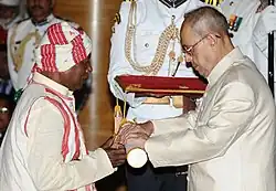In 1964, the villagers elected him as the Parha Raja (Chief of the tribe) and he initiated the social forestry program at his ancestral property which he continues, planting 1000 trees every year, to prevent soil erosion and depletion of water resources.[7] He formed a 25-member village committee with the representation of all the nearby villages which administers the forestry drive. He also heads the people's movement which fights against deforestation and illegal felling of trees. His efforts are reported to have assisted in the cultivation of over 2000 acres of land, producing three crops a year and yielding 20,000 mt of vegetables annually.[9] He served as the Prime Minister's Rural Development Fellow during 2012–14.[7] The Government of India honored him with the civilian award of the Padma Shri in 2016.[10][11]