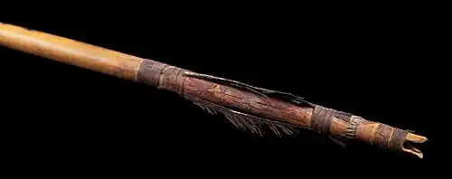 Close view of the sinew wrapped split feathers on a Sinagua arrow mainshaft from Montezuma Castle
